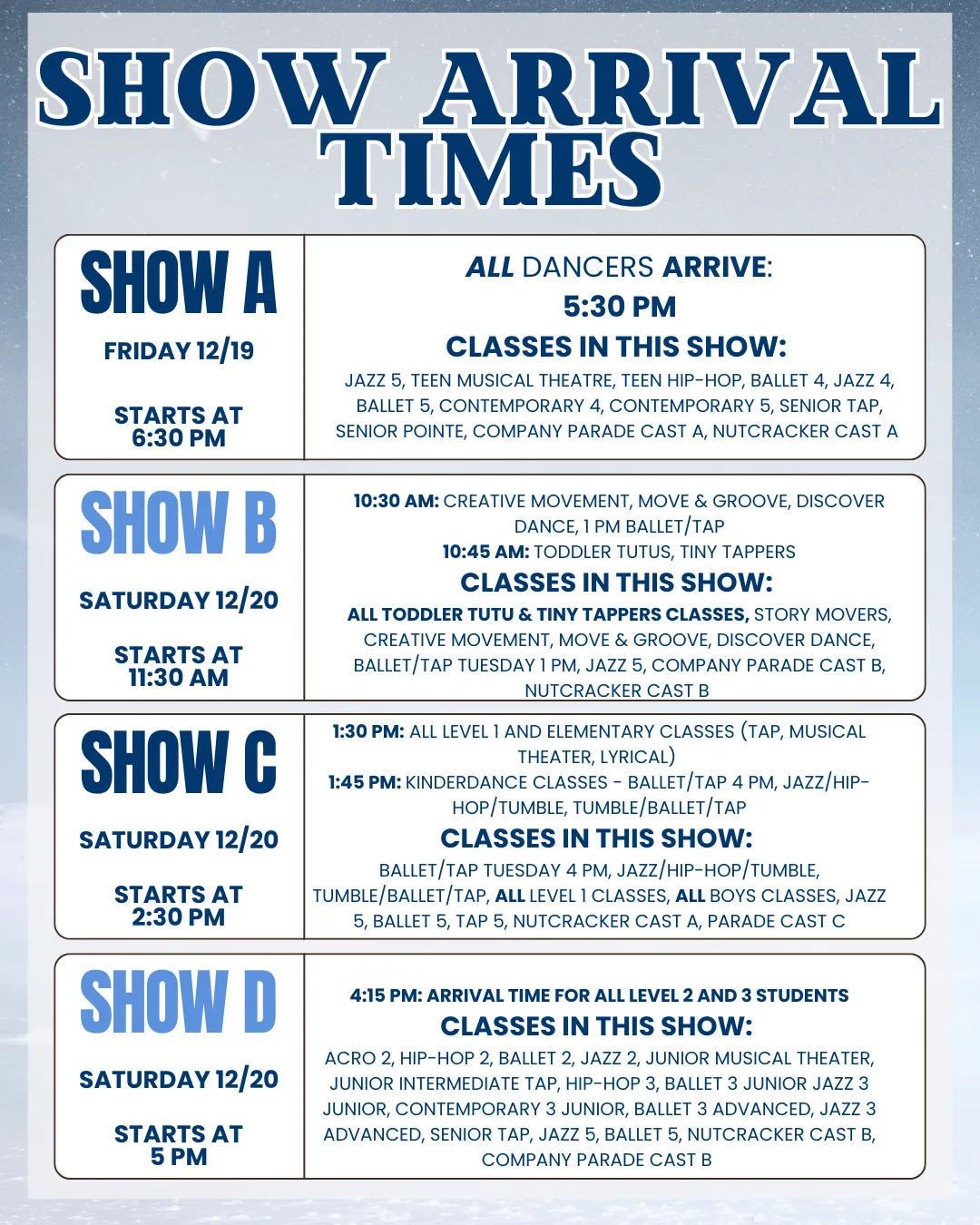 Performing in Show A 12/19 at 6:30 pm and Show C 12/20 at 2:30 pm